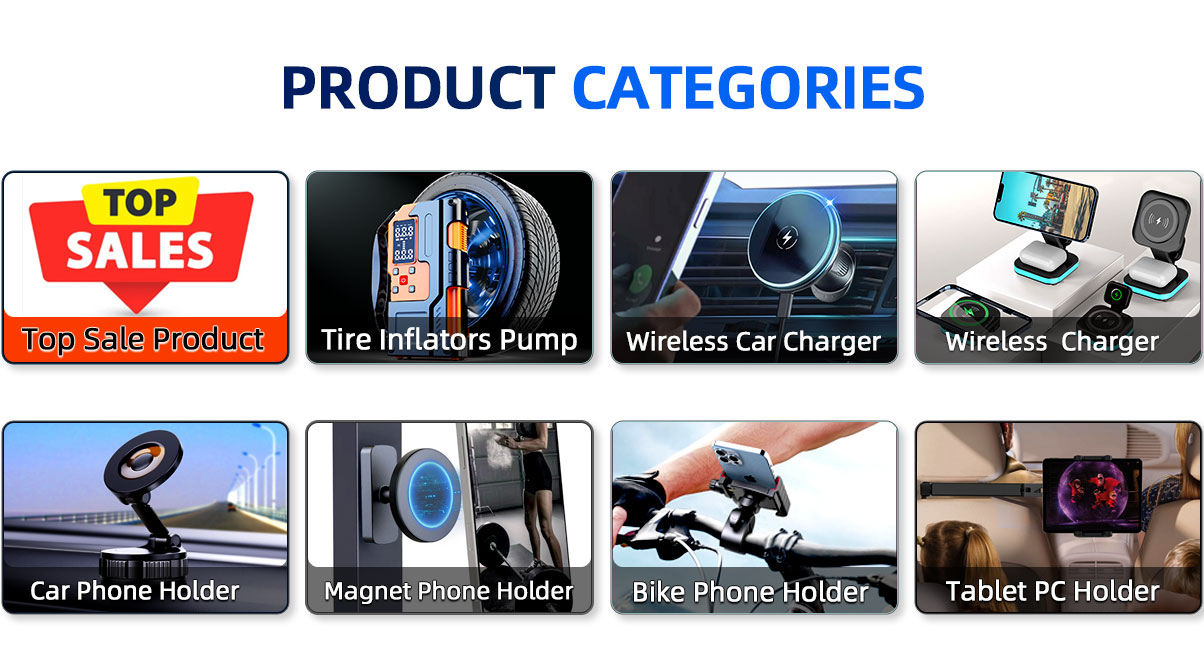 Productos principales:Cargador inalámbrico, soporte para teléfono, bomba de aire